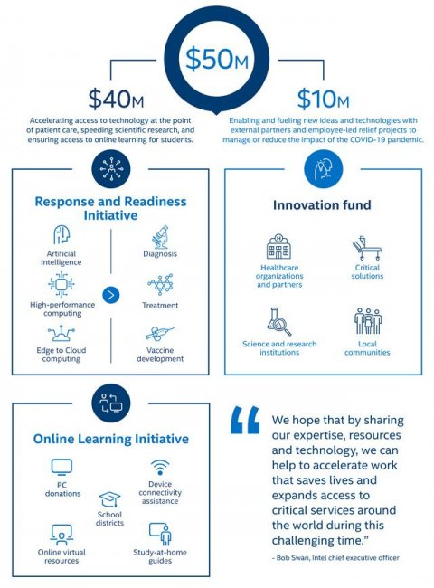 На нужды борьбы с последствиями коронавируса Intel первично выделила $10 млн, сорок процентов этой суммы собрали сотрудники компании. Теперь корпорация направляет на аналогичные цели ещё $50 млн в надежде ускорить создание вакцины и устройств, облегчающих жизнь пациентов, уже заразившихся COVID-19.