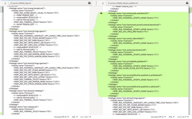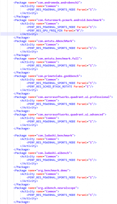 При более подробном рассмотрении в файлах прошивки устройства нашёлся подозрительный файл power_whitelist_cfg.xml. Обычно он находится в директории /vendor/etc. Содержимое файла включало различные настройки управления питанием для разных популярных синтетических тестов (GeekBench, AnTuTu, 3DBench, PCMark и других), в которых изменению подвергается параметр, называющийся «спортивным режимом» (Sports Mode).