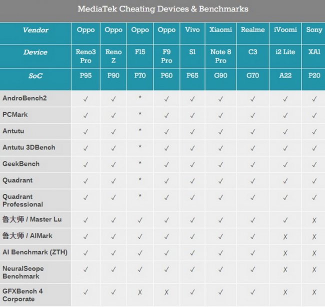 Изменения настроек DVFS были обнаружены не только в смартфонах Oppo Reno3 Pro, работающих на базе разных процессоров MediaTek, но и на устройствах других производителей, которые оказались на руках у журналистов. Со списком можно ознакомиться ниже — галочками обозначено искусственное завышение результатов.