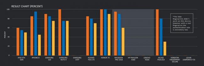 Самыми стойкими к взлому с помощью муляжей пальцев оказались устройства HP Pavilion x360, Samsung A70 и Lenovo Yoga. Ни один из опробованных инженерами Cisco методов не позволил обойти систему аутентификации. Зато взломать Samsung Galaxy S10 и Apple iPhone 8 удалось в 80 % случаев (попыток). Ноутбук MacbookPro и вовсе открылся в 95 % случаев.