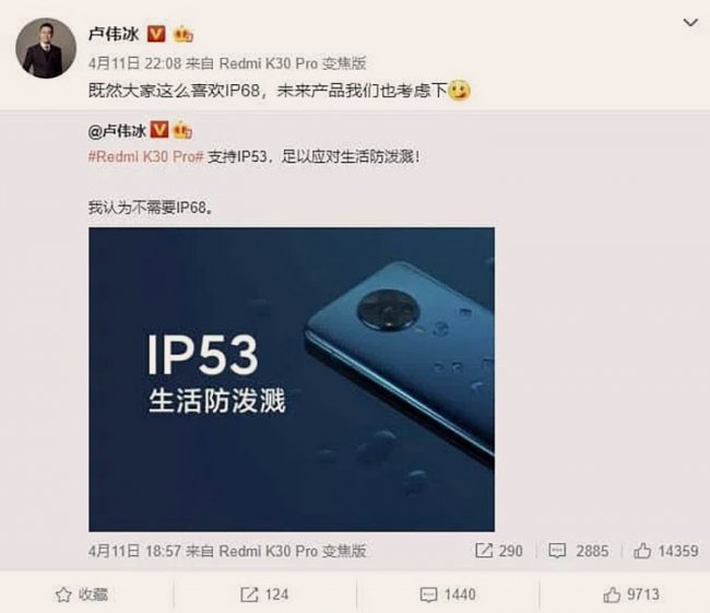 Недавно вице-президент Xiaomi Group и исполнительный директор Redmi Лу Вейбинг (Lu Weibing) написал в социальной сети Weibo: «Redmi K30 Pro поддерживает IP53, чего достаточно для защиты от брызг. Я думаю, что IP68 не нужен». Но, похоже, его мнение оказалось не особенно популярным среди поклонников: комментарии показали, что значительная часть людей хочет появления в смартфонах более серьёзной защиты с рейтингом IP68.