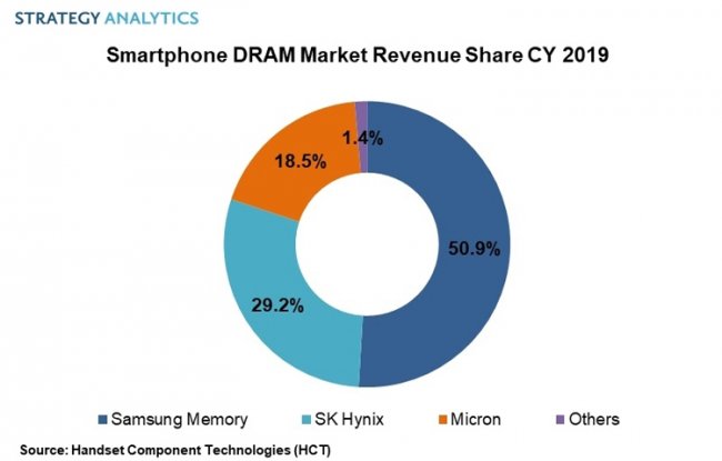 Бесспорным лидером отрасли является Samsung Memory с долей около 47 % в денежном выражении. Далее следуют SK Hynix и Micron. Сообща эти три производителя в 2019 году заняли примерно 84 % глобального рынка чипов памяти для смартфонов в плане выручки.
