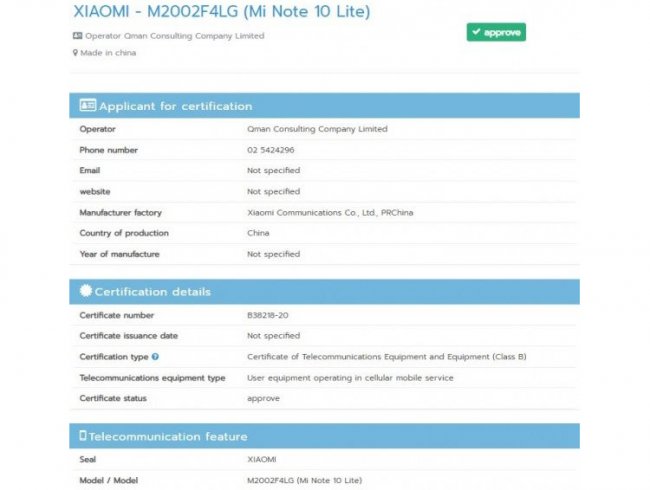 В ноябре прошлого года китайская компания Xiaomi анонсировала производительные смартфоны Mi Note 10 и Mi Note 10 Pro, оснащённые 108-мегапиксельной камерой. Вскоре к этим аппаратам присоединится модификация Mi Note 10 Lite. Интернет-источники сообщают о том, что новинка сертифицирована Национальной комиссией по вещанию и телекоммуникациям Таиланда (NBTC). Устройство фигурирует под кодовым обозначением M2002F4LG. Сообщается, что основой смартфона послужит процессор Snapdragon 730G. Чип содержит восемь вычислительных ядер Kryo 470 с тактовой частотой до 2,2 ГГц и графический ускоритель Adreno 618. Объём оперативной памяти якобы составит 6 Гбайт, вместимость флеш-накопителя — 128 Гбайт. Питание обеспечит аккумуляторная батарея ёмкостью 5260 мА·ч с поддержкой быстрой 30-ваттной подзарядки. Упомянут 6,47-дюймовый дисплей Full HD AMOLED. Что касается основной камеры, то вместо 108-мегапиксельного датчика будет применён 64-мегапиксельный. Компанию ему составят два 8-мегапиксельных сенсора, а также датчики на 5 млн и 2 млн пикселей. Смартфон Mi Note 10 Lite будет поставляться с операционной системой Android 10, дополненной фирменной надстройкой MIUI 11. Информации об ориентировочной цене на данный момент, к сожалению, нет.