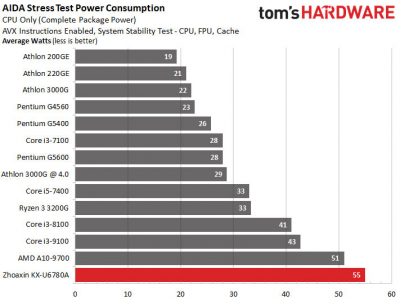 Энергопотребление сложно надёжно измерить из-за особенностей платы Zhaoxin и питания, но максимальная потребляемая мощность через 8-контактный разъём превышает 55 Вт при стресс-тесте AIDA. К счастью для китайской компании, она планирует перейти на 7 нм в серии KX-7000, что должно привести к улучшению показателей в этой области.
