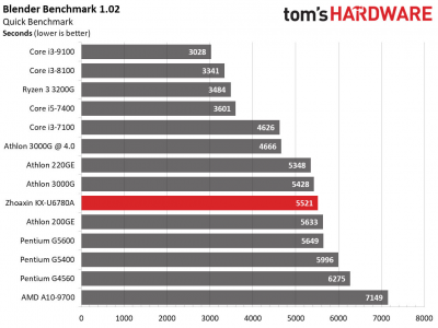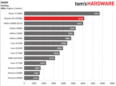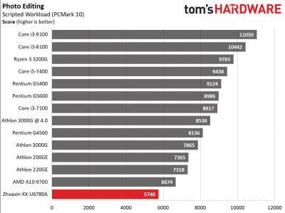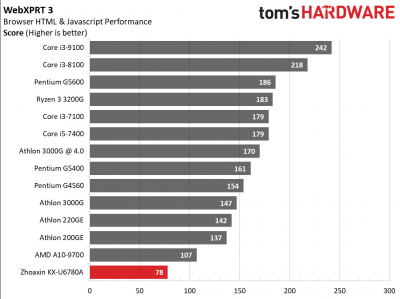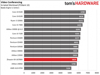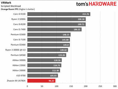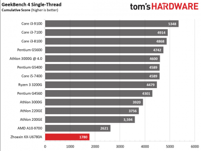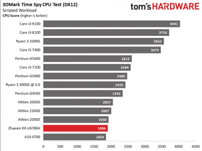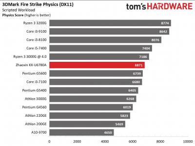 Tom's Hardware протестировал KX-U6780A в ряде тестов и игр, используя RTX 2080 Ti, и результаты в значительной степени оказались предсказуемыми. Процессор Zhaoxin показал в тесте физики 3DMark Fire Strike 6871 очков — чуть ниже 7404 у Intel i5-7400.