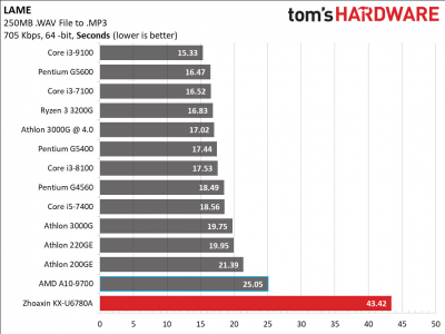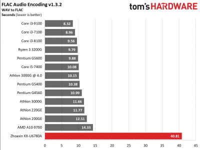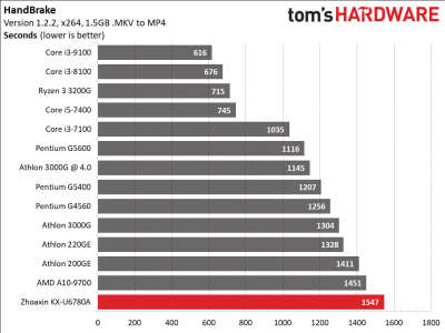 KX-U6780A также не блещет в тестах веб-браузера и в измерениях скорости запуска приложений. То же самое можно сказать и о производительности кодирования, которая как минимум в два раза ниже в Handbrake: как с кодеком x264, так и с x265. Единственные реальные области, в которых процессор Zhaoxin проявил некоторые свои возможности — это тесты сжатия и распаковки 7-Zip и Zlib.