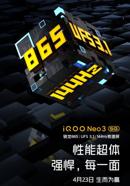 Тизеры говорят о том, что официальная презентация iQOO Neo 3 5G состоится 23 апреля. Аппарат будет поставляться с операционной системой Android 10.