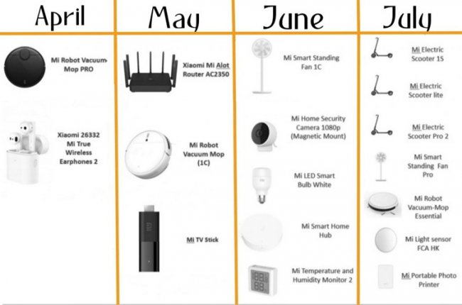 На июнь намечен анонс «умного» вентилятора Mi Smart Standing Fan 1C, камеры видеонаблюдения Mi Home Security Camera 1080p с магнитным креплением, смарт-лампы Mi LED Smart Bulb White, центра управления «умным» домом Mi Smart Home Hub, а также монитора температуры и влажности Mi Temperature and Humidity Monitor 2.