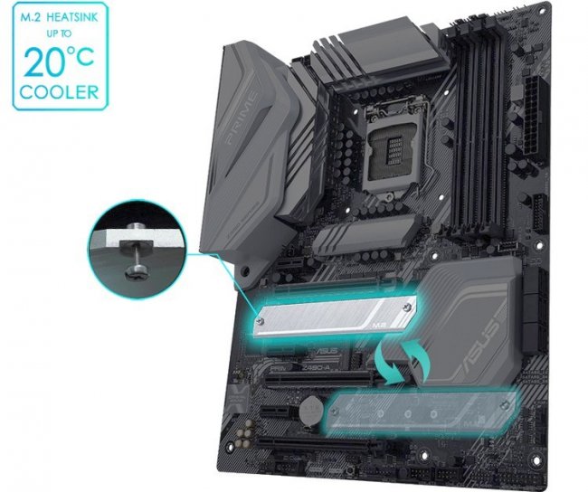 В свою очередь плата Prime Z490-A, судя по внешнему виду, является более продвинутой новинкой. Она обладает более массивными радиаторами охлаждения, и, вероятно, подсистемой питания с большим числом фаз. Также у неё на слотах M.2 для твердотельных накопителей имеются радиаторы. К сожалению, о характеристиках этой платы подробностей нет.