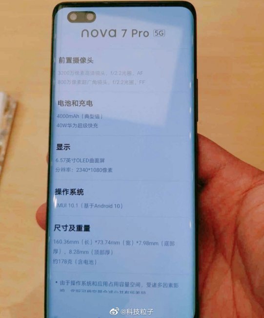 В оснащение Nova 7 войдёт 6,53-дюймовый экран FHD+ OLED с разрешением 2400 ? 1080 точек и небольшим отверстием для одинарной селфи-камеры на основе 32-мегапиксельного датчика. Размеры аппарата — 160,64 ? 73,33 ? 7,96 мм, масса — 180 г.