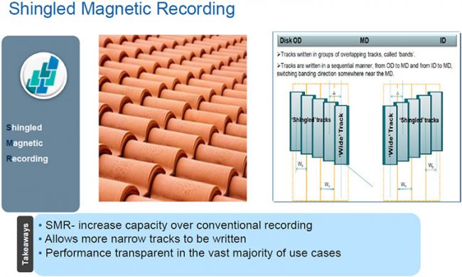 Метод черепичной магнитной записи SMR даёт возможность нарастить ёмкость накопителя на 15–20 %. Однако технология имеет существенные недостатки, ключевым из которых выступает снижение скорости перезаписи данных, что может быть весьма критично при использовании в ПК.