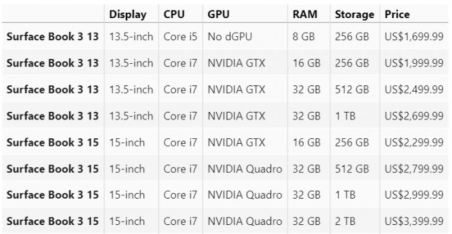 Старшие версии Surface Book 3 15 будут оснащены уже профессиональным ускорителем NVIDIA Quadro, правда каким именно не уточняется. Хотелось бы верить, что это будут некие мощные Quadro RTX на базе Turing. Также в этих ноутбуках будет Core i7, 32 Гбайт оперативной памяти и от 512 Гбайт до 2 Тбайт хранилища на SSD. Стоимость составит от $2800 до $3400.