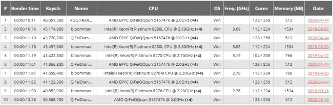 В итоге благодаря разгону китайскому энтузиасту удалось установить рекорд в рейтинге бенчмарка Corona Renderer. Его система с двумя инженерными образцами EPYC 7742 смогла показать производительность выше 48 млн лучей в секунду, что на 3 млн больше предыдущего рекорда, установленного системой с четырьмя Intel Xeon Platinum 8280L. Заметим, что пара EPYC 7742 обладает 128 ядрами и 256 потоками, тогда как четыре Xeon Platinum 8280L имеют лишь 112 ядра и 224 потока.