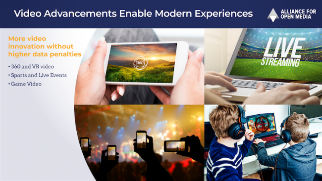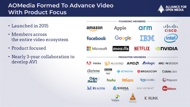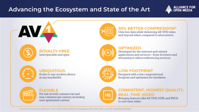 Видеокодек AV1 с открытым исходным кодом разрабатывался с 2015 года инженерами из ряда компаний, включая Amazon, BBC, Netflix, Hulu и другими, создавшими Alliance for Open Media (AOMedia). Новая технология предназначена в первую очередь для потокового видео в сверхвысоких разрешениях (4K и выше), с расширенной цветовой палитрой и различными технологиями HDR. Среди главных особенностей кодека AOMedia указывает на 30 % более эффективный алгоритм сжатия по сравнению с существующими методами, предсказуемые требования к вычислительным возможностям аппаратного обеспечения, а также максимальную гибкость и масштабируемость.