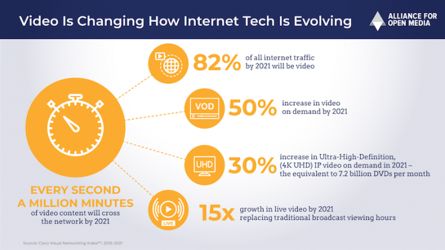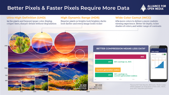 Указанным компаниям с собственными стриминговыми сервисами эффективные кодеки нужны как воздух. Во-первых, AV1 позволяет снизить требования к пропускной способности Интернет-соединения как на уровне центров обработки данных (ЦОД), так и на уровне провайдеров и конечных пользователей. Во-вторых, использование Amazon Studios 65-мм плёнки и камер IMAX MSM 9802 (которую очень сложно арендовать) и RED Monstro для фильма Аэронафты (The Aeronauts) показывает, что компания готовится к пост-4K эре, когда текущие кодеки не будут казаться столь же эффективными.