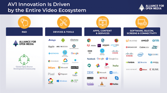 Создатели AV1 рассчитывают на его повсеместное распространение на всех платформах, потому следует ожидать, что он будет поддерживаться не только крупными разработчиками микросхем, создателями программного обеспечения и поставщиками услуг, но и ведущими производителями бытовой электроники.