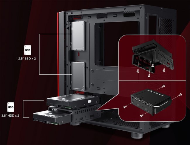 Подсистема хранения данных может объединять два накопителя типоразмера 3,5 дюйма и два устройства в формате 2,5 дюйма. Длина блока питания не должна превышать 165 мм.