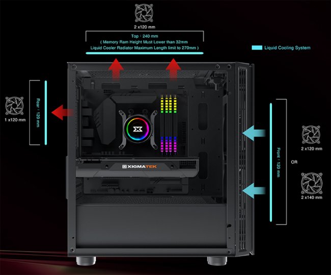 Допускается установка пяти 120-мм вентиляторов — два спереди, два сверху и один сзади. Можно задействовать жидкостное охлаждение с фронтальным и верхним 240-мм радиаторами, а также тыльным 120-мм радиатором. Ограничение по высоте процессорного кулера — 170 мм.