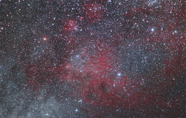На представленном изображении, в частности, запечатлена полоса Млечного пути. На фото видны бесчисленные звёзды, тёмные волокна пыли и светящиеся облака космического газа.
