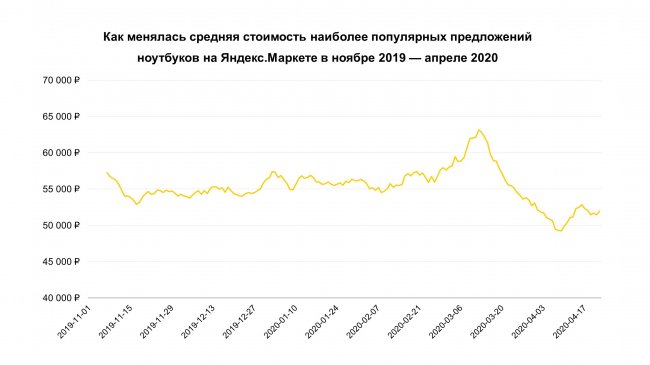 Рынок ноутбуков оставался стабильным до 8 марта, после чего стал наблюдаться резкий рост продаж. Пик пришёлся на 19 марта: по сравнению с 5 марта спрос увеличился на 85 %. Если прежде средняя стоимость покупаемых моделей составляла 56 тысяч рублей, то накануне 8 марта она поднялась до 63 тысяч рублей и продолжила расти. Но уже в начале апреля средняя стоимость наиболее популярных предложений снизилась до 49 тысяч рублей и сейчас варьируется в пределах 50–53 тысяч.