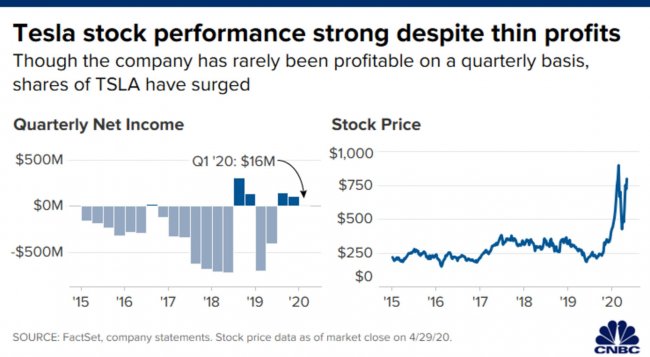 Стоимость ценных бумаг Tesla выросла более чем на 9 % после публикации компанией результатов деятельности в отчётном первом квартале — несмотря на влияние пандемии COVID-19 автопроизводитель демонстрирует прибыльность третий квартал подряд.