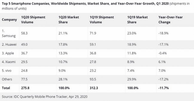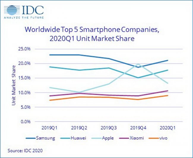 Лидером по объёму мировых поставок смартфонов за первый квартал 2020 года стала южнокорейская компания Samsung. На рынок она поставила 58,3 млн устройств, что составляет 21,1 % от общего объёма. В то же время это на 18,9 % меньше, чем годом ранее. К концу первого квартала прошлого года на долю Samsung приходилось 23 % мировых поставок.