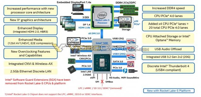 Предполагается, что вычислительные ядра Rocket Lake-S с архитектурой Willow Cove будут располагаться на отдельном 14-нм кристалле, а графическая часть переедет на отдельный 10-нм кристалл. Шина DMI 3.0 для связи процессора с чипсетом расширится до режима x8, сам процессор будет поддерживать до 20 линий PCI Express 4.0, появится поддержка более быстрых режимов работы памяти и новых возможностей в разгоне. Следующие за процессорами Rocket Lake-S представители семейства Alder Lake-S потребуют использования материнских плат с новым разъёмом LGA 1700.