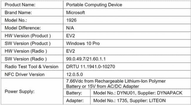В документации ведомства новинка фигурирует под модельным номером 1926 и описанием «портативное компьютерное устройство». В качестве программной платформы значится операционная система Windows 10 Pro.