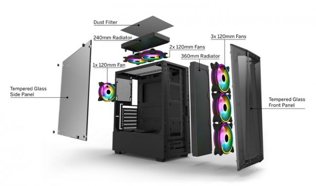 Корпус выполнен в чёрном цвете и поддерживает установку материнских плат форм-факторов ATX, Micro-ATX и Mini-ITX. Фронтальная панель позволяет установить радиатор системы жидкостного охлаждения длиной до 360 мм и/или три вентилятора размером 120 мм. Сверху имеется место под установку радиатора длиной до 240 мм и/или двух вентиляторов 120 мм. Сзади — одно посадочное место для 120-мм вентилятора. В верхней части корпуса предусмотрен пылевой фильтр.