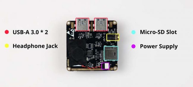 Далее следует вторая компактная системная плата, содержащая основные компоненты LarkBox и остальные разъёмы: процессор, чипы памяти, накопитель, модуль беспроводной связи, разъёмы USB Type-C и HDMI.