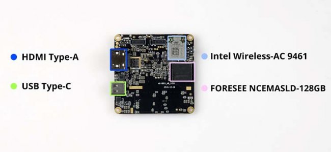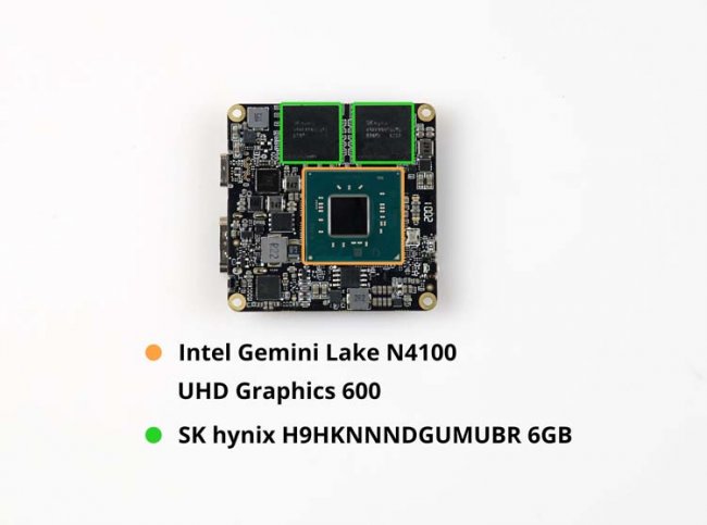 Большую часть платы занимает процессор Intel Gemini Lake N4100 с интегрированной графикой UHD Graphics 600 и два чипа оперативной памяти SK Hynix H9HKNNNDGUMUBR LPDDR4 ёмкостью 3 Гбайт каждый. Ёмкость твердотельного накопителя FORESEE NCEMASLD составляет 128 Гбайт. Беспроводную связь обеспечивает адаптер Intel Wireless-AC 9461 с поддержкой стандартов Wi-Fi 802.11a/b/g/n/ac и Bluetooth 5.0.