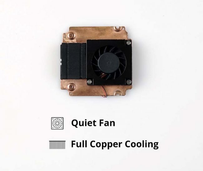 Несмотря на компактные размеры, у мини-ПК имеется активная система охлаждения с небольшим вентилятором со сверхнизким уровнем шума, не превышающим 20 дБ при работе устройства на полную мощность.