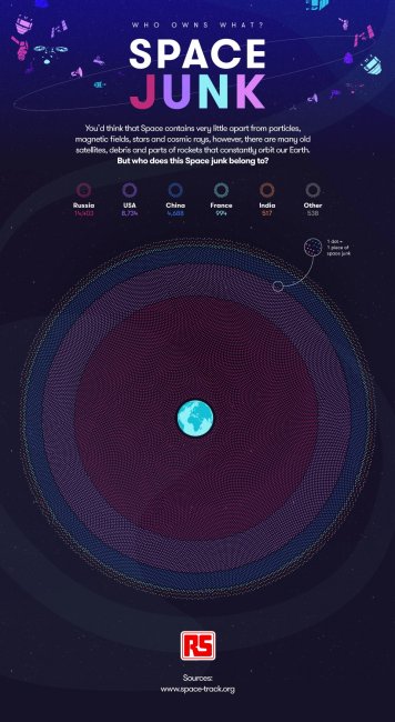 На орбите нашей планеты находятся тысячи частиц, кусочков и обломков космического мусора различного размера и формы, представляющих потенциальную опасность для орбитальных спутников и Международной космической станции. Но кому он принадлежит? Какая страна больше всего мусорит в космосе? Ответ на этот вопрос предоставила британская компания RS Components, назвавшая пятёрку самых мусорящих стран. Критерии причисления мусора к той или иной стране не объявлены, поэтому вопрос со смешанными запусками (например, когда Россия с помощью одной ракеты-носителя отправляет в космос спутники нескольких стран) остался без уточнения.