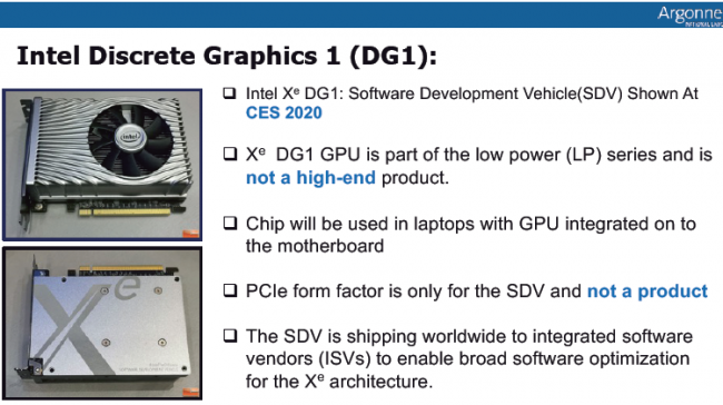 Во-первых, авторы документа напоминают, что Xe DG1 относится к графике начального уровня. Во-вторых, единственной формой применения серийной версии этого продукта станет размещение на материнской плате ноутбуков. В-третьих, вариант DG1 в виде платы расширения с интерфейсом PCI Express реализован только для нужд разработчиков программного обеспечения, и в серийном воплощении предлагаться не будет. Его задача заключается в широком охвате сообщества разработчиков на этапе формирования программной экосистемы для выхода других графических решений семейства Intel Xe.