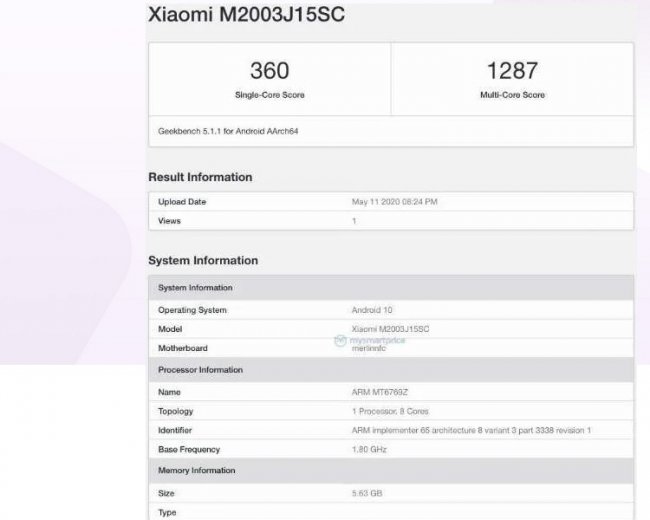 Redmi 10X появился в базе данных GeekBench V5.1.1 с номером модели M2003J15SC. В протестированном устройстве используется чипсет MediaTek MT6769Z с тактовой частотой 1,8 ГГц, который представляет собой ни что иное, как Helio G70, который и упоминался в Google Play Console. Подтвердилось и использование актуальной ОС Android 10. Однако объём оперативной памяти протестированного устройства составляет 6, а не 4 Гбайт, что подразумевает выпуск смартфона в нескольких модификациях.