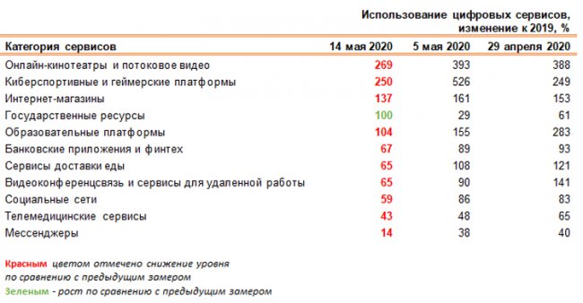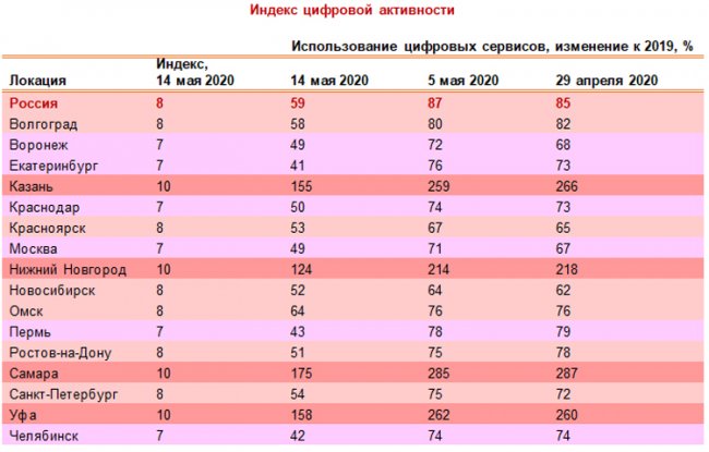 В конце апреля в связи с самоизоляцией граждан индекс цифровой активности в целом по России достиг значения 9: потребление цифровых сервисов по сравнению с 2019 годом поднялось на 85–87 %. В некоторых городах и вовсе был зафиксирован рост более 250 %.