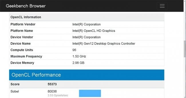 Пользователь Twitter, скрывающийся под ником TUM_APISAK, нашёл в базе данных популярного бенчмарка GeekBench результат тестирования графического адаптера Intel. Устройство было идентифицировано как Intel Gen 12 Desktop Graphics Controller. Согласно данным бенчмарка, устройство было протестировано в составе компьютера с процессором Core i7-8700 с 16 Гбайт оперативной памяти стандарта DDR4 с установленной на нём 64-битной Windows 10 Enterprise.