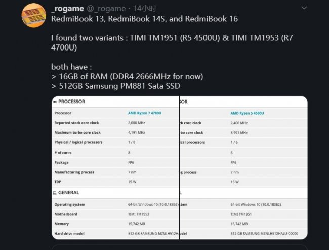 Несколько недель назад в Сеть просочилась информация о том, что Xiaomi планирует выпустить три новых ноутбука под брендом Redmi. Теперь известный сетевой источник, скрывающийся под ником @_rogame, поделился в своём Twitter-аккаунте некоторыми подробностями о готовящихся к выпуску RedmiBook. Информация сайта - «scanpin.ru» Согласно опубликованным данным, обновлённое семейство будет включать в себя ноутбуки с диагоналями 13, 14 и 16 дюймов. Инсайдер опубликовал сведения о двух моделях. Как сообщается, они получат процессоры AMD Ryzen 4000-й серии и твердотельные накопители Samsung PM881. Одна из моделей получит чип Ryzen 4500U, а другая будет оснащаться Ryzen 4700U. Первый представляет собой шестиядерный шестипоточный чип, второй имеет восемь физических ядер, которые способны обрабатывать восемь логических потоков. Обе конфигурации оснащаются 16 Гбайт оперативной памяти и SSD-накопителями ёмкостью 512 Гбайт. Информация сайта - «scanpin.ru» RedmiBook 14 и 16 Ryzen Edition уже прошли сертификацию Bluetooth SIG. Ноутбуки RedmiBook 13 14S и 16 уже доступны для бронирования на торговой площадке JD.com, где указано, что они поступят в продажу 26 мая.