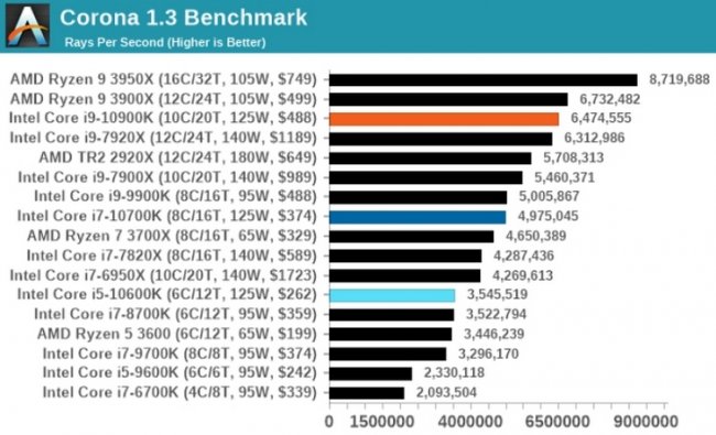 Сегодня в продажу поступили первые процессоры Intel Core десятого поколения (Comet Lake-S), и профильные западные ресурсы опубликовали обзоры некоторых из новинок. 3DNews, к сожалению, похвастаться подобным не может по независящим от нас причинам, поэтому ниже проведён обзор западной прессы. Начнём, конечно же, с флагмана новой серии — Core i9-10900K. Данный процессор обладает десятью ядрами, двадцатью потоками и 20 Мбайт кеша третьего уровня. Базовая частота чипа составляет 3,7 ГГц, а максимальная частота при автоматическом разгоне достигает 5,3 ГГц. Как и все другие чипы семейства Comet Lake, новинка построена на микроархитектуре Skylake и выполнена по 14-нм техпроцессу. Процессор Core i9-10900K ожидаемо показывает весьма высокий уровень производительности как в играх, так и в рабочих задачах. В рендеринге 3D-графики новинка Intel максимально приблизилась к своему прямому конкуренту в лице Ryzen 9 3900X при использовании большинства рендереров, а в POV-Ray 3.7.1 и вовсе смогла оказаться впереди. Примечательно, что 10-ядерная новинка Intel оказалась быстрее 12-ядерного Core i9-7920X. Тесты в рабочих задачах Core i9-10900K Intel_Core_i9-10900K_11.jpg Смотреть все изображения (9) Intel_Core_i9-10900K_10.jpg Intel_Core_i9-10900K_09.jpg Intel_Core_i9-10900K_08.jpg Intel_Core_i9-10900K_07.jpg Intel_Core_i9-10900K_06.jpg Intel_Core_i9-10900K_05.jpg Intel_Core_i9-10900K_04.jpg Intel_Core_i9-10900K_03.jpg Смотреть все изображения (9) Работа с архивами в 7-Zip показала аналогичную картину: Core i9-10900K немного не дотянул до Ryzen 9 3900X, тогда как в WinRar чип Intel оказался быстрее. При кодировании и декодировании видео в Handbrake процессор Intel максимально приблизился к 16-ядерному Ryzen 9 3950X при использовании кодека HEVC, а вот с более старым x264 оказался немного медленнее Ryzen 9 3900X. Игровые тесты Intel Core i9-10900К в разрешении Full HD Intel_Core_i9-10900K_16.jpg Смотреть все изображения (5) Intel_Core_i9-10900K_15.jpg Intel_Core_i9-10900K_14.jpg Intel_Core_i9-10900K_13.jpg Intel_Core_i9-10900K_12.jpg Смотреть все изображения (5) В игровых тестах Core i9-10900K показал не всегда однозначные результаты, но в основном он оказался производительнее предшественников и конкурентов. Так, в разрешении Full HD (1920 ? 1080 точек) новинка оказалась безоговорочным лидером, оторвавшись даже от «суперфлагмана» прошлого поколения Core i9-9900KS в среднем на 2–3 %. Игровые тесты Intel Core i9-10900К в разрешении 4K Intel_Core_i9-10900K_22.jpg Смотреть все изображения (5) Intel_Core_i9-10900K_21.jpg Intel_Core_i9-10900K_20.jpg Intel_Core_i9-10900K_19.jpg Intel_Core_i9-10900K_18.jpg Смотреть все изображения (5) А вот в более высоком разрешении 4K (3840 ? 2160 точек) процессор Core i9-10900K почему-то уступил соперникам во многих тестах. Местами он проиграл даже шестиядерным Core i5-9400F и Core i5-10600K. Более того, в отдельных ситуациях производительнее нового флагмана Intel оказался и народный AMD Ryzen 5 3600. Тем не менее, в среднем быстродействие нового процессора Intel Core i9-10900K оказалась на очень высоком уровне. После множества слухов и шокирующих предположений по поводу энергетических аппетитов, мы не смогли обойти стороной вопрос тепловыделения и потребления Core i9-10900K. Новинка оказалась и вправду весьма прожорливой: в простое вся система с этим процессором потребляла 53 Вт, а под нагрузкой — 278 Вт. Аналогичная конфигурация на Core i9-9900K потребляла 36 и 210 Вт соответственно, а на Ryzen 9 3900X — 43 и 198 Вт соответственно. По данным другого источника, новый чип Intel действительно способен в одиночку затребовать до 254 Вт энергии. Что касается рабочих температур, то под нагрузкой Core i9-10900K нагревается вплоть до 92 °C. Правда, здесь источник не уточняет, какая именно система охлажде