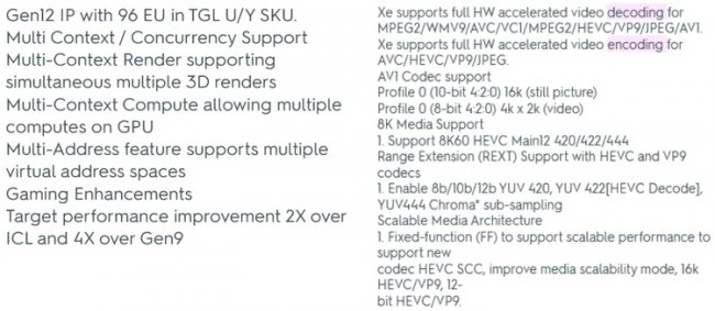 На данный момент мы уже довольно много знаем о грядущих мобильных процессорах Intel Tiger Lake благодаря множеству слухов и утечек от них. Теперь же в Сети оказались, как утверждается, фрагменты документации Intel, которые могут подтвердить прежние утечки и раскрыть новую информацию о встроенной графике будущих CPU. Представленные изображения хоть и не отличаются высоким качеством, но выглядят достаточно похожими на презентации Intel для партнёров. Процессоры Tiger Lake придут на смену актуальным мобильным чипам Ice Lake. Как и предшественники, они будут производиться по 10-нм техпроцессу, но улучшенному и доработанному. Intel выпустит две серии чипов: Tiger Lake-Y и Tiger Lake-U. В первом случае TDP составит 9 Вт, но при желании производители ноутбуков смогут уменьшить его вплоть до 5 Вт. В случае с Tiger Lake-U по умолчанию TDP будет установлен в 28 Вт, а производители ноутбуков смогут уменьшать его до 15 или 10 Вт. Напомним, в большинстве актуальных Ice Lake-U стандартный TDP составляет 15 Вт и его наоборот можно повысить до 25 Вт. Процессоры Tiger Lake будут выпускаться в конфигурации «4 2», что означает наличие четырёх процессорных ядер Willow Cove и двух «ядер» встроенной графики с архитектурой Intel Xe (12-го поколения). Графическая часть будет включать до 96 исполнительных блоков (Execution units, EU), то есть до 768 шейдеров. Таким образом Intel планирует составить конкуренцию встроенной графике Vega второго поколения мобильных процессоров Ryzen 4000. Отдельно стоит обратить внимание на возможности аппаратного видеокодека новой графики. Согласно представленным данным, графика Intel 12-го поколения предложит поддержку декодирования современных стандартов AV1, 12-битных VP9 и H.265/HEVC. В итоге новая «встройка» Intel сможет обеспечить воспроизведение видео в разрешении до 8K при 60 FPS. Также сообщается, что Intel ставила целью увеличить производительность встроенной графики 12-го поколения в Tiger Lake в два раза по сравнению с графикой 11-го поколения с Ice Lake. Это соответствует недавней утечке о производительности Intel Xe. А по сравнению с более старой графикой девятого поколения (Comet Lake, и многие другие CPU) производительность должна вырасти до четырёх раз.