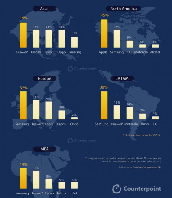 В лидерах остаётся Samsung: доля южнокорейского гиганта по итогам прошлого квартала составила приблизительно 20 %. Компания Huawei вместе с дочерним брендом Honor заняла 17 % мирового рынка. Замыкает тройку Apple с 14 %. Далее следуют китайские Xiaomi и OPPO с результатом соответственно 10 % и 8 %.