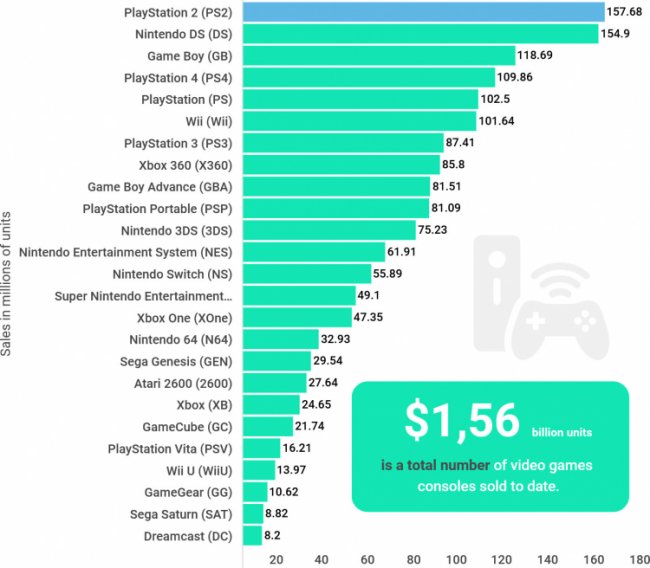 Идёт 2020 год, и игры выпускаются для самых разнообразных систем, а на консольном рынке продолжается активное противостояние PS4 с Xbox One наряду со спокойным развитием Switch в своей нише. Однако сколько консолей за всё время было продано по миру? По данным на конец марта 2020 года, в мире было продано 1,56 миллиарда игровых консолей за все время их существования.