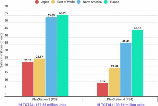 Статистика также показывает, что на долю Европы приходится больше всего продаж PlayStation. PS2 в Европе было продано 55,28 млн единиц, а PS4 — 45,12 млн. Северная Америка не сильно отстаёт в этих показателях: 53,65 млн для PS2 и 36,34 млн для PS4. Кстати, недавняя статистика показала, что для PS4 было продано более 1 млрд игр.