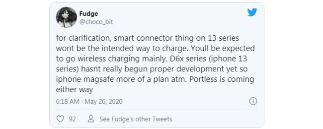 Минг-Чи Куо (Ming-Chi Kuo) утверждает, что флагманская модель iPhone 2021 года будет использовать для связи с внешним миром исключительно беспроводные интерфейсы. Зарядка, как предполагается, будет возможна только при помощи беспроводных станций с поддержкой стандарта Qi. Smart Connetor будет применяться только для подключения внешних аксессуаров и восстановления программного обеспечения устройств.