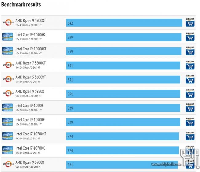 Согласно представленным данным, процессор Ryzen 9 3900XT в указанном тесте набрал 542 балла, тогда как результаты Core i9-10900K и 10900KF составили 539 баллов. При этом процессор AMD достигает в автоматическом разгоне при нагрузке на одно ядро лишь частоты в 4,8 ГГц, тогда как у флагманов Intel этот показатель равен 5,3 ГГц. В свою очередь Ryzen 7 3800XT и Ryzen 5 3600XT с частотами до 4,7 ГГц показали результаты, равные флагманскому Ryzen 9 3950X — 531 балл. Для сравнения: Core i9-10900(F) и Core i7-10700K(F) показывают в одноядерном тесте Cinebench R20 результаты в 529 и 524 балла соответственно.