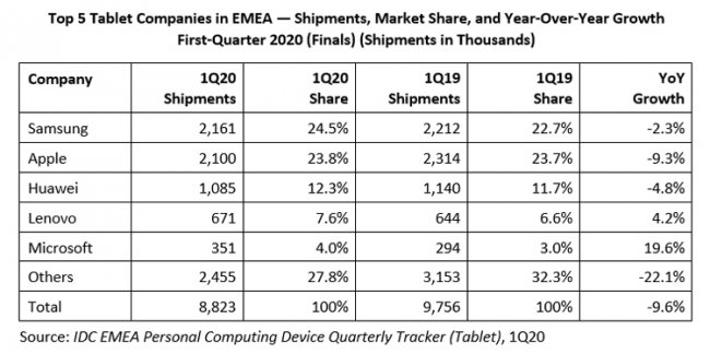 Аналитики International Data Corporation (IDC) оценили расстановку сил на рынке планшетных компьютеров в регионе EMEA (Европа, включая Россию, Ближний Восток и Африка) в первом квартале нынешнего года в условиях пандемии. Несмотря на переход сотрудников многих компаний на удалённую работу, а школьников и студентов — на дистанционное обучение, спрос на планшеты серьёзно сократился. В период с января по март включительно на рынке EMEA было реализовано около 8,8 млн таких гаджетов. Это на 9,6 % меньше по сравнению с результатом за первую четверть 2019-го, когда продажи равнялись 9,8 млн единиц. Крупнейшим поставщиком планшетов в регионе EMEA является Samsung с долей в 24,5 %. Годом ранее южнокорейский гигант занимал приблизительно 22,7 % отрасли. «Серебро» досталось Apple, которая удерживает 23,8 % рынка против 23,7 % годом ранее. Замыкает тройку Huawei с долей в 12,3 % (11,7 % в первом квартале 2019 года). Далее следуют компании Lenovo и Microsoft, результат которых по итогам первой четверти 2020-го составил соответственно 7,6 % и 4,0 %. Все прочие поставщики сообща удерживают немногим более четверти рынка планшетных компьютеров в регионе EMEA — приблизительно 27,8 %.