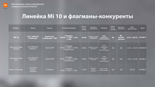 Сегодня прошла большая пресс-конференция Xiaomi, на котором были представлены шесть новых аппаратов для отечественного рынка. Недавно компания открыла 100-й магазин в России. А на Яндекс.Маркете лидерами недавно были названы Redmi Note 8T и Redmi Note Pro. В нашей стране зарегистрированы уже более 3 млн Mi-фанов. Но главным событием стал выход Mi 10 в России. Глава пресс-службы Xiaomi в России Евгений Мосунов провёл сегодня онлайн-презентацию, представив ряд новинок для нашего рынка. Первыми устройствами стала, конечно, серия флагманских смартфонов Mi 10, представленная в Китае ещё в феврале. Характеристики всё те же, зато компания назвала цены для российского рынка. Сердцем выступает 7-нм однокристальная система Snapdragon 865, дополняемая 5G-модемом Snapdragon X55. 6,67-дюймовый дисплей AMOLED (2340 ? 1080) с частотой 90 Гц (частота работы сенсорного слоя — 180 Гц) отличается перфорацией под лицевую камеру в верхнем левом углу, яркостью 1120 кд/м2, контрастностью — 5 000 000:1, поддержкой HDR10 , 4096 уровнями регулировки яркости, расширенным цветовым охватом и функцией снижения мерцания при низкой яркости (DC Dimming). Под экраном размещён сканер отпечатков пальцев. Среди других особенностей можно упомянуть ОЗУ LPDDR5 (от Micron и Samsung), скоростной накопитель UFS 3.0 (до 730 Мбайт/с), эффективный отвод тепла благодаря продвинутой интеллектуальной системе охлаждения, симметричные стереодинамики и дополнительный датчик освещённости на тыльной стороне для более точной автоматической регулировки яркости подсветки экрана. Xiaomi Mi 10 способен писать видео на основную камеру в разрешении 8K при 30 кадрах/с, поддерживает редактирование видео с помощью ИИ, фотографический формат HEIF и так далее. Фронтальная 20-Мп камера способна вести запись видео Full HD с частотой до 120 кадров/с. В Mi 10 речь идёт о связке четырёх тыльных модулей, дополненных светодиодной вспышкой: 2-Мп с диафрагмой f/2,4 (пиксели размером 1,75 мкм); основной модуль с оптической стабилизацией и 108-Мп датчиком 1/1,33