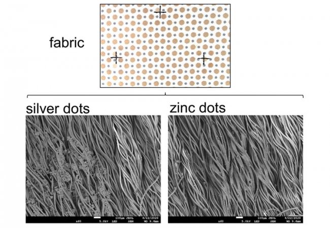 Разработчики из Университета Индианы продемонстрировали ткань с регулярными вкраплениями точек из цинка и серебра. Ткань может быть полиэстером или хлопком. В присутствии влаги, например, от выдыхаемого воздуха, точки образуют классическую батарею на восстановительно-окислительной реакции. Электроны движутся от серебра к цинку по влажной ткани, и их перемещение сопровождается генерацией слабых электрических полей. При этом разность потенциалов меду точками-электродами может достигать 0,5 В.