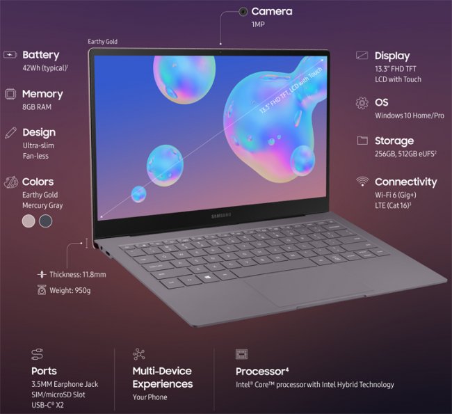 Компания Samsung Electronics сегодня, 29 мая, официально представила портативный компьютер Galaxy Book S, о подготовке которого сообщалось около полутора недель назад. Новинка стала первым ноутбуком на аппаратной платформе Intel Lakefield. Как и говорилось ранее, устройство оборудовано 13,3-дюймовым дисплеем Full HD с разрешением 1920 ? 1080 пикселей. Реализована поддержка сенсорного управления. В Samsung не называют модель применённого процессора, но ранее сообщалось об использовании чипа Core i5-L16G7, объединяющего четыре маломощных ядра с архитектурой Tremont и одно производительное ядро Sunny Cove. Стало известно, что в оснащение новинки входит модем LTE (Cat 16), благодаря которому пользователи смогут подключаться к Интернету везде, где есть покрытие сотовой сети. Кроме того, присутствуют адаптеры беспроводной связи Wi-Fi 6 (Gig ) 802.11ax 2?2 и Bluetooth 5.0. Ноутбук получил 8 Гбайт оперативной памяти LPDDR4x, флеш-накопитель eUFS вместимостью 256/512 Гбайт, слот microSD, 1-мегапиксельную камеру, аудиосистему AKG с четырьмя динамиками, дактилоскопический сканер, датчик освещённости, клавиатуру с подсветкой и два порта USB Type-C. За питание отвечает аккумуляторная батарея ёмкостью 42 Вт·ч. Габариты составляют 305,2 ? 203,2 ? 6,2–11,8 мм, вес — 950 г. На компьютер установлена операционная система Windows 10 (Home или Pro). Устройство доступно в цветовых исполнениях Earthy Gold и Mercury Gray.