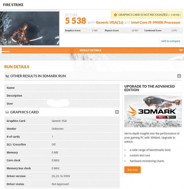 В тесте 3DMark Fire Strike видеокарта Intel Xe DG1 набрала 5960 баллов. Для сравнения, наиболее производительная встроенная графика Intel Iris Plus одиннадцатого поколения, используемая в процессорах Intel Core i7-1065G7 (Ice Lake), набирает в том же тесте всего около 3000 баллов. Получается мы действительно видим почти двукратный прирост производительность встроенной графики Intel следующего поколения, обещанный недавними слухами. Конечно, если сравнивать с игровыми GPU начального уровня, например, Radeon RX 560 и GeForce GTX 1050 Ti, то видеокарта Intel Xe DG1 ощутимо уступает.
